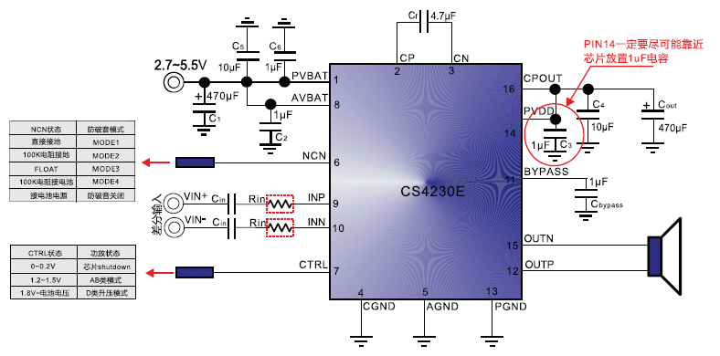 CS4230E是一款采用 CMOS工藝 ,電窯式升壓型 GF類單 聲道音頻功放,可以為4Ω的負載O供最高4.8W的連續功 率;CS4230E芯片內部固定的28倍增益,有效的減少了 外圍元器件的數量;功放集成了D類和AB類兩種工作模式 即可保證D類模式下強勁的功率輸出,又可兼顧系統在有 FM的情況下,消除功放對系統的干擾;CS4230E具有獨 特的防破音(NCN)功 能,可根據輸出信號的大小自動調整 功放的增益,實現更 舒適的昕覺感受,其4種防破音模式 的選擇為不同的工程要求O供了最大的挑選余地 ;另 外,CS4230E還具備電源自適應能力,當電源電壓低的時 候,功放會自動降低增益,從而減少功放的輸出功率.CS4230E的外圍只有低成本的阻窯器件,在以徨電池供電 的移動式音頻設備中,CS4230E是理想的音頻子系統的功 放解決方案.CS4230E的全差分架構和極高的PSRR有效地提 高了CS4230E對RF噪聲的能力 。另外CS4230E內置了過流保護,短路保護和過熱保護,有效的保護芯片在異常的工作條件下不被損壞。CS4230E供了ESOP16的封裝類型,真額定的工作溫度范圍為-40℃至85℃。